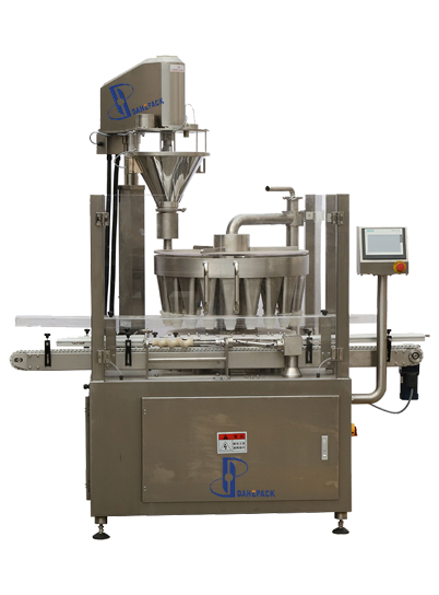 旋轉(zhuǎn)式充填機(jī)具有很高的生產(chǎn)效率和生產(chǎn)速度,即使在非??量痰纳a(chǎn)要求下,旋轉(zhuǎn)式充填系統(tǒng)將物料連續(xù)的分發(fā)到旋轉(zhuǎn)的多工位漏斗里,瓶子在漏斗下,一個(gè)瓶子對(duì)應(yīng)一個(gè)漏斗,不等距螺旋和星形轉(zhuǎn)盤將瓶子均勻的對(duì)應(yīng)到每一個(gè)漏斗下同步旋轉(zhuǎn)并振動(dòng),螺桿計(jì)量機(jī)精確的將物料充填到漏斗里,然后物料在星形轉(zhuǎn)盤旋轉(zhuǎn)四分之三圈的時(shí)間內(nèi)從漏斗落到瓶子里,特別適用于瓶子口徑小,但包裝速度要求高的各種粉末和小顆粒物料。