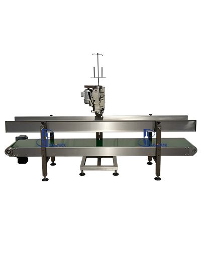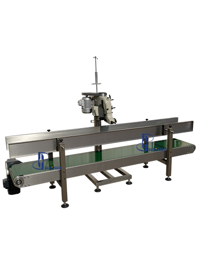 工作方式:裝縫包機(jī)裝配在輸送機(jī)上;開啟電源后輸送機(jī)開始運(yùn)轉(zhuǎn),向前輸送裝滿物料的袋子,當(dāng)袋子到達(dá)縫包機(jī)壓腳處,接近開關(guān)感應(yīng)到袋子自動(dòng)啟動(dòng)縫包機(jī),運(yùn)行到設(shè)定的時(shí)間達(dá)到時(shí)自動(dòng)停止,縫好每一袋時(shí)手推袋角切刀剪切線辮。